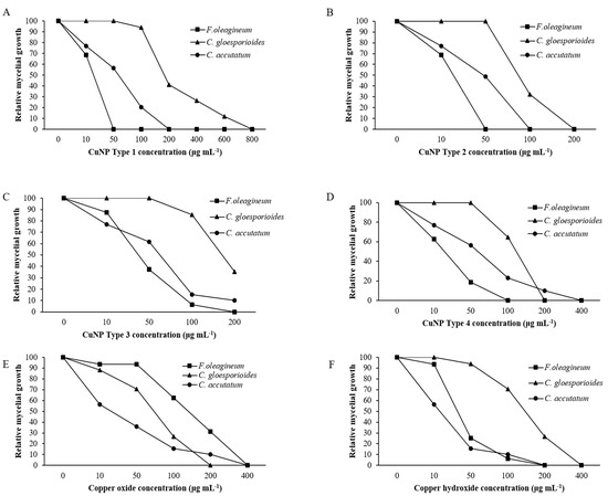 Mean relative mycelial growth of Fusicladium oleagineum, Colletotrichum acutatum s.s., and Colletotrichum gloesporioides s.s. isolates on artificial nutrient media amended with several concentrations of CuNP Type 1 (A), CuNP Type 2 (B), CuNP Type 3 (C), CuNP Type 4 (D), Copper oxide (E), and Copper hydroxide (F).