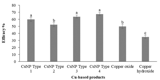 Efficacy (%) of Cu-NPs and conventional Cu-product treatments against Fusicladium oleagineum in experiments conducted in one-year-old olive trees (cv. Chalkidikis) incubated in a plant growth chamber. Treatments’ efficacy (%) assessments were based on the disease incidence measurements on the untreated control plants. Different letters on the columns indicate significant differences according to Fisher’s LSD test at p = 0.05. Vertical lines indicate the standard error of the mean.