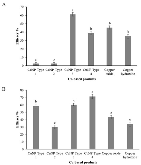 Efficacy (%) of Cu-NPs and conventional Cu-product treatments against Colletotrichum accutatum s.s. on (A) olive inflorescences and (B) on olive fruit. Treatments’ efficacy (%) assessments were based on the disease incidence measurements on the untreated control plants. Different letters on the columns indicate significant differences according to Fisher’s LSD test at p = 0.05. Vertical lines indicate the standard error of the mean.