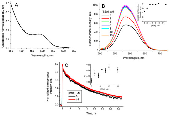 CdTe-3-MPA QD (A) absorption spectrum, normalized by absorbance at 350 nm, (B) QD luminescence spectrum (λex = 490 nm) for different BSA concentrations, (inset: the integral QD luminescence intensity in function of the BSA concentration) and (C) QD luminescence decay curves (λex = 490 nm, λem = 580 nm) for [BSA] = 0 and [BSA] = 15 μM (inset: the contribution of the long-lived luminescence decay component R2 in function of the BSA concentration).