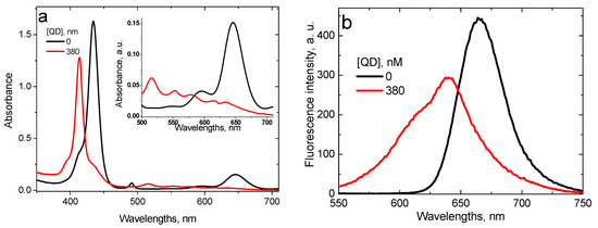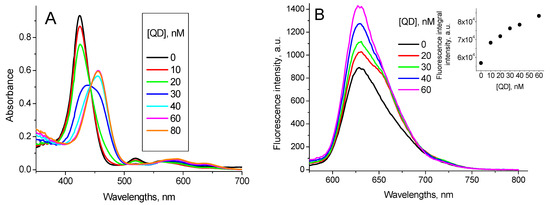 Another series of experiments was made adding QD into the solution containing TMPyP and BSA. It was shown formerly [37] that TMPyP and BSA form a complex characterized by the optical absorption spectrum with Soret peak at 425 nm and three peaks in the Q region (Figure 4A) and fluorescence spectrum with a peak at 629 nm (Figure 4B). The binding constant of TMPyP with BSA was estimated as KTMPyP_BSA = 7.3 × 105 M−1 [37].