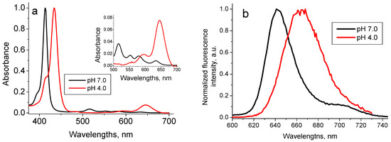 Normalized optical absorption (a) and fluorescence spectra (λex = 420 nm) (b) of 1.6 µM TPPS4 in the bi-protonated (pH 4.0) and non-protonated (pH 7.0) states [39].