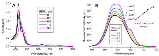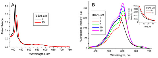 Optical absorption (A) and fluorescence (λex = 417 nm) (B) spectra of 1.6 µM TPPS4 water solution at pH 7.0 in the absence and presence of 3 µM BSA [37].