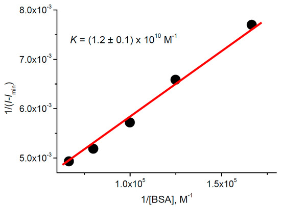 where Imin, I and Imax are integral luminescence intensities in the absence of BSA, for BSA concentration [BSA] and for the BSA excess.