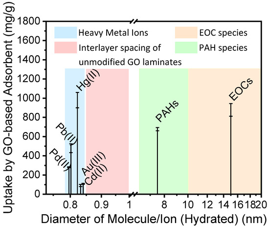 Figure 1 summarizes the radius of ions and molecules identified as major contaminants and their uptake amount by GO-based adsorbents. As Figure 1 demonstrates, very few studies have focused on adsorption of ions and molecules with a hydrated diameter between 8.5 to 10 Å, using GO-based adsorbents. Depending on the preparation method, the interlayer spacing of GO laminates varies from 8.5 to 10 Å [33,34,35]. The GO-based adsorbents have not been used significantly in the past due to the possible variation of interlayer spacing of GO in the presence of water [25,36]. As a result, it is difficult to obtain reliable adsorption amount from the contaminants with a radius in this range. However, artificial system with size-dependent separation function is of great interest for modern separation technology such as the extraction of Li+ from seawater and removal of ions such as Cs+ from radioactive waste.