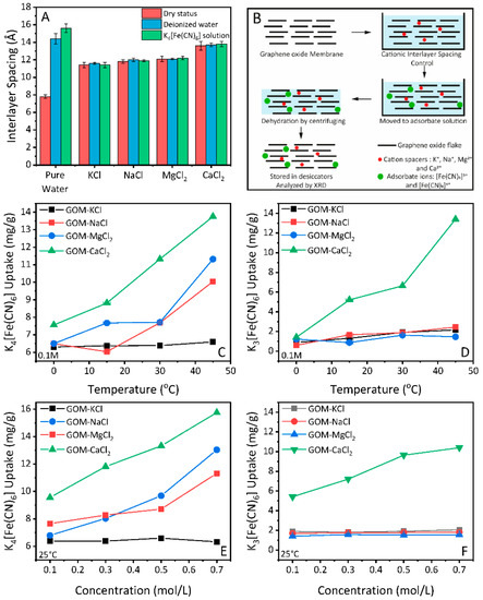 Figure 3C,D present how the temperature affects the weight uptakes of those cationic controlled GOMs upon being placed in the 0.1M K4[Fe(CN)6] and K3[Fe(CN)6] solutions. For the smaller ion ([Fe(CN)6]4−, 8.44 Å), the amount of ion adsorption for all controlled samples (NaCl-GO, MgCl2-GO, and CaCl2-GO) shows an uptrend under an increased temperature (Figure 3C), indicating a relatively low energy barrier for adsorption. In the case of the KCl-GO sample (black curve in Figure 3C), which has a quite narrow laminated structure, the adsorption keeps almost constant. This is reasonable as a high energy barrier is required to overcome for the [Fe(CN)6]4− ion entering such a small opening at this temperature.