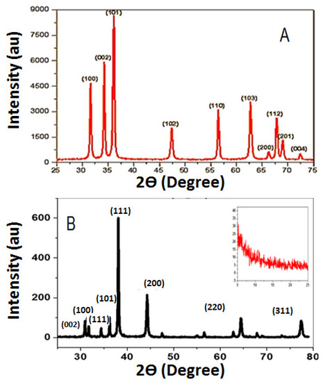 XRD patterns of ZnO NPs and nanocomposite were investigated and shown in Figure 1. The characteristic diffraction peaks of pure ZnO NPs in Figure 1A were detected at 2θ of 31.67°, 34.31°, 36.14°, 47.40°, 56.52°, 62.73°, 66.28°, 67.91°, 69.03°, and 72.48°. These peaks are corresponding to (100), (002), (101), (102), (110), (103), (200), (112), (201), and (004) planes of ZnO NPs. These peaks are in good agreement with the characteristic peaks of the polycrystalline wurtzite ZnO structure (Zincite, JCPDS 5-0664). [37]. The obtained value of the average crystallite size of ZnO NPs was ~22 nm. In Figure 1B, the characteristic diffraction peaks of the ZnO–Ag/PPy nanocomposite displayed a broad peak about 2θ = 10°, indicating that the PPy inside the nanocomposite matrix is highly amorphous. Furthermore, it displayed intense diffraction peaks at 2θ = 31.7°, 34.3°, 36.2°, 47.5°, and 56°. i.e., the hexagonal crystalline ZnO NPs embedded in the composite have peaks corresponding to (100), (002), (101), (102) and (110) lattice planes, with the preferred peak at 2θ = 36.2°, and a d-spacing of 2.48 Å [37]. For the face-centered cubic (fcc) structure of Ag nanoparticles, narrow and extreme diffraction peaks were observed at 38.2°, 44.4°, 64.4°, and 77.3° due to Bragg’s reflections from (111), (200), (220), and (311) lattice planes, respectively [38]. The average crystallite size of Ag is equal to ~40 nm [37].