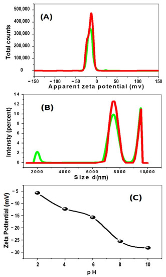 The zeta potential is a key character for many applications, including the characterization of polymers. The isoelectric point (IEP) is the pH of a compound solution at which the net charge or its zeta potential is zero. The used experimental method can change the value of the isoelectric point due to the measurement techniques. Therefore, there are several different values of IEP for the same ZnO in the literature. For example, IEP values of ZnO were found at pH 8.0, 9.7, 9.8, and 10.3 [39]. The size comparison showed that the solutions with pH less than 3 and greater than 7 have smaller nanoparticles, whereas, in the pH range 3–7, the Ag nanoparticles have a larger size, which is consistent with a possible aggregation of the nanoparticles. The pH is directly related to the stability of the nanoparticles. The change in pH can alter the double-layer properties that can directly influence the zeta potential of the system, making the chances of flocculation or coagulation because each type of nanoparticles is stable near the isoelectric point. AgNPs exhibited an effective charge change in aqueous conditions, from positive (in low pH) to negative (at high pH), with an isoelectric point between them, in which it presented a smaller size value [39]. After modifying another compound as polypyrrole, the composite becomes negatively charged over the whole examined pH range. It was obvious that the pH dependence of zeta potentials for ZnO nanoparticles shifted completely after forming the core–shell structure [40]. The nanocomposite’s zeta-potential as a function of pH was measured at different pH values; 2, 4, 6, 8, and 10; to better understand the stability of nanoparticles in the adsorption process. The zeta potential of nanocomposite showed a typical dependence on pH value, as shown in Figure 3A–C and Table S1. The nanocomposite displayed negative zeta potentials in the pH range from 2 to 10. This is related to the presence of different redox states of nanocomposite at different pH values. Protonation increases at low pH due to the production of radical cations and the binding of protons to the amine groups, decreasing negative zeta potential. The lowering of the negative zeta potential magnitude above pH 8 due to deprotonation of the amine groups of PPy resulted in less oxidation and decreased negative sites [41]. As predicted, the integration of PPy with silver nanoparticles results in a negative charge. As a result, the sample had a large particle size distribution (959 nm), as calculated by DLS measurements (Figure 3). This value is larger than that reported using SEM or TEM images, as illustrated in Figure 2. This is because the DLS technique permitted ZnO NPs to aggregate in an aqueous solution, while the SEM or XRD techniques do not allow for aggregation because the samples are measured dry.