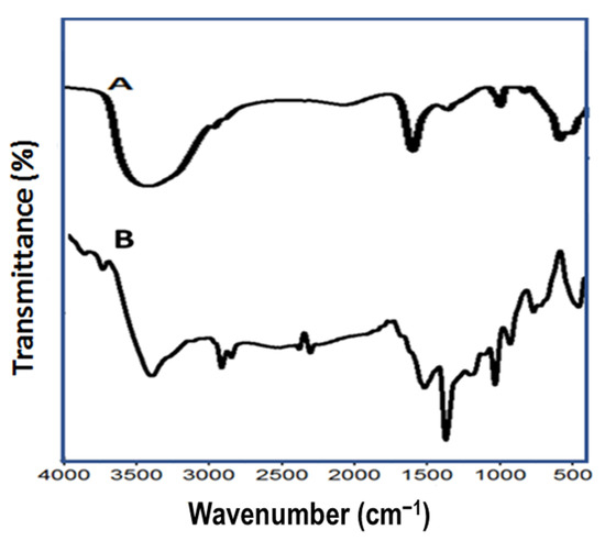 FTIR spectra of (A) ZnO and (B) ZnO–Ag/PPy nanocomposite.