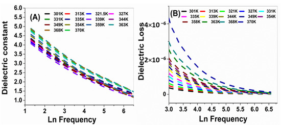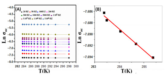 It was found that σac was positively correlated with frequency at all studied temperatures, which may be due to the increase of the movement of the dipole molecular chains within the nanocomposite at high temperatures. In addition, the components of nanocomposite act as captures of the charge carriers, which are transported by the hopping process. Figure 6A shows the variation of ln(σac) as a function of T in Kelvin. The σac at higher frequencies showed weak temperature dependence. The activation energy (ΔEa) is calculated at different frequencies from the slope of the straight lines in Figure 6B according to Equation (4);