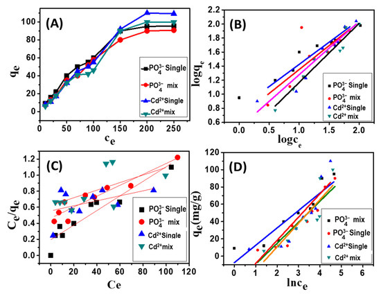 Equilibrium studies of Cd2+ and PO43− adsorption using the synthetic composite; effect of the initial concentration on the adsorption capacity (A), Freundlich isotherm model (B), Langmuir isotherm model (C), and Temkin isotherm model (D).