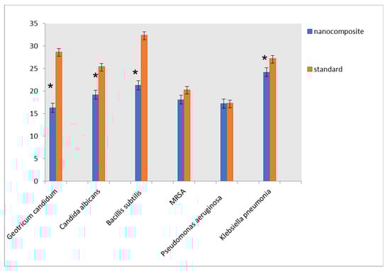 Antimicrobial activity and MIC of nanocomposite for different microorganisms. * studied composite is statistically significant from the standard at p values less than 0.05.