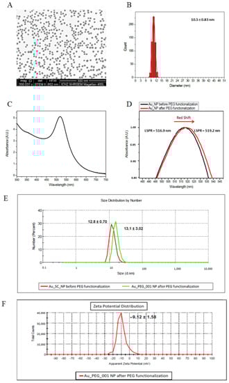 Basic characteristics of PEG-AuNPs. (A) TEM image of PEG-AuNPs; the bar represents 300 nm; (B) corresponding histograms of size distribution, (C) UV-vis spectra of the colloidal AuNPs suspension; (D) localized surface plasmon resonance (LSPR) of PEG-AuNPs; (E) hydrodynamic diameters measured by dynamic light scattering (DLS) for AuNPs and PEG-AuNPs, (F) zeta potential distribution of PEG-AuNPs.