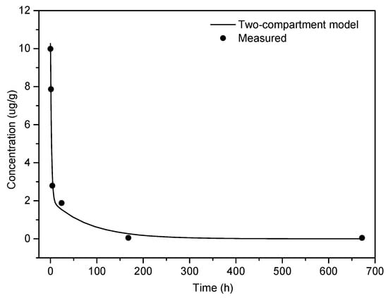 The time course of PEG-AuNPs concentration in blood was analyzed using a non-PBPK two-compartment model with elimination from the central compartment. In this case, the peripheral compartment did not correspond to any specific tissue or organ and the whole analysis was based solely on data from the central compartment (blood). The concentration in the central compartment follows a bi-exponential function
