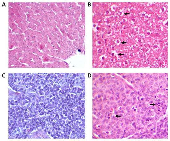 Histopathologic changes detected in rats exposed to the liver (A,B) and spleen (C,D). Cytoplasmic vacuolation (arrows) observed in rat hepatocytes at 7 days after single i.v. injection of PEG-AuNPs. Hematoxylin-eosin, magnification 20×. Shrinking of cells (arrows) in the splenic white pulp indicating apoptotic morphology observed in rat spleen 24 h after single i.v. injection of PEG-AuNPs. Hematoxylin-eosin, magnification 40×.
