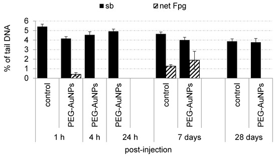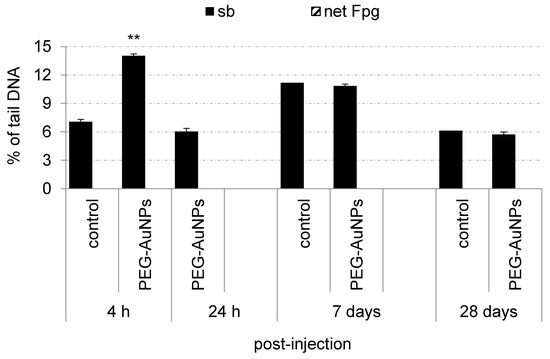 The impact of PEG-AuNPs on genome stability, including their capacity to induce oxidative DNA damage, was evaluated in the blood mononuclear cells and primary renal cells. PEG-AuNPs induced neither increased levels of DNA breakage nor oxidative DNA damage compared to the control group in blood cells during the whole study (Figure 4). In contrast, a significant rise of DNA strand breaks compared to control was determined at 4 h post-injection of PEG-AuNPs but not at other time intervals in primary renal cells (Figure 5). The basal levels of sb and oxidative DNA damage in control primary renal cells after short-term treatment were evaluated only at 1 h after PBS administration. This time-point interval was selected to avoid false-positive results in the case of PEG-AuNPs-injected animals as a consequence of the anesthesia.