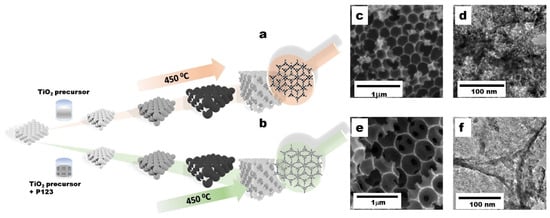 Rational designs of nanostructures generally involve nanoscale building blocks on the surface of materials [,,]. For example, 0D-3D TiO2 nanostructures showed significantly enhanced photocatalytic performance [,,,,,,,,]. In particular, 3D structures can enlarge the specific surface area, resulting in high photodegradation capability [,,,,,,,,]. For instance, Zhang et al. prepared Au-doped three-dimensional macro-porous (3DOM) TiO2 that show high photocatalytic performance, as indicated by complete decolorization of Methylene Blue (30 mg/L) within ~60 min []. Ma et al. reported the Bi2S3/3DOM TiO2 composite exhibiting impressive photocatalytic degradation of Rhodamine B within (10 mg/L) within approx. 360 min []. 3D-TiO2 can be synthesized by sol-gel, solvothermal, self-assembly, and template-assisting methods []. The resulting inverse opal structures could effectively enhance absorption and multiple reflections of light in the material [,,,]. Moreover, a double templating technique has attracted considerable interest as it provides additional mesopores, forming hierarchical structures with rich functionality such as increased surface area, improved solar absorption [,] improved charge transfer ability [], and enhanced dye adsorption [,,,,]. Introduction of mesopores inside the conventional macroporous 3DOM could lead to hierarchical nanostructures with enhanced dye adsorption and overall photocatalytic performance. Conventionally, silica [], poly(methyl methacrylate) (PMMA) [,,,,], and polystyrene [,] spheres are the popular templates used for fabricating the 3DOM structures, while pluronic 123 is known as the effective soft template to create regular mesopores [].