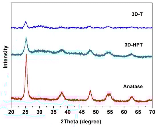 X-ray diffraction (XRD) patterns of the commercial TiO2, 3D-T, and 3D-HPT catalysts.