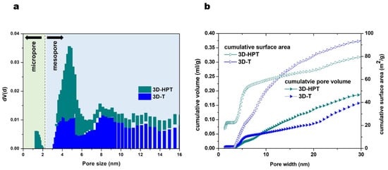 (a) Pore size distribution and (b) cumulative of pore volume and surface area of 3D-T and 3D-HPT catalysts.