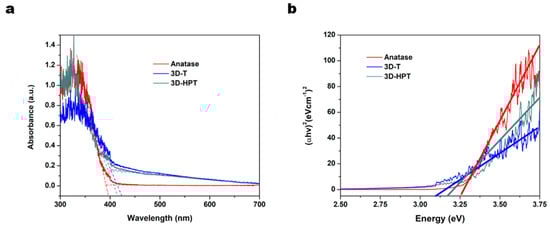The UV–visible absorption spectra of 3D-T, 3D-HPT show the red shift of absorption edge compared to the commercial TiO2, due to the 3DOM structure (Figure 4a) []. The band gap energy was calculated based on the Tauc plot with the equation:
