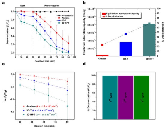 (a) Adsorption and decolorization of Remazol red dye under the dark, and light irradiation. (b) The equilibrium adsorption capacity and the percentage of decolorization at 20 min of photoreaction. (c) Rate of decolorization reaction derived from anatase TiO2 (red), 3D-T (blue), and 3D-HPT (dark cyan) catalysts. (d) Recyclability tests of 3D-HPT (showing percentage of decolorization of the dye after 60 min of phothocatalytic reaction). The reactivity remained unchanged after the repeated uses for three cycles.
