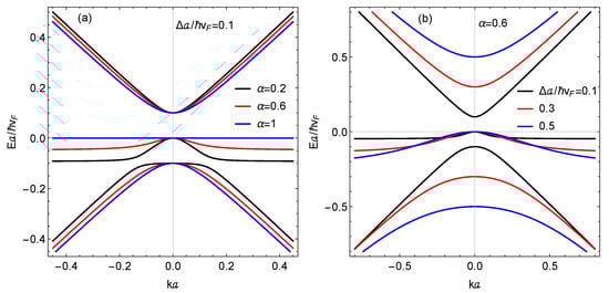 Energy dispersion (in units of , where a is the lattice parameter) as a function of wave number (in units of ) ) of the subbands determined by solving Equation (3) with the mass term having (a) and the hopping parameter is , and . In (b), we chose and calculated the subband spectra for various values of in units of .
