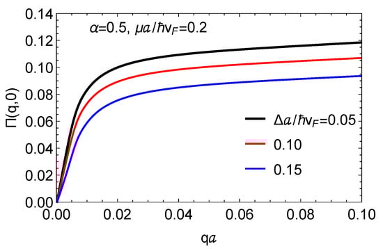 In Figure 2, we present the static polarization function at zero temperature for various mass term parameters . The hopping ratio is fixed at , and the chemical potential is set at . These results show that, as the value of the mass term is increased, the static polarization is decreased. This dependence allows for the tunability of static charge screening by gapped – materials, as well as image states, which may be probed by photoemission experiments.