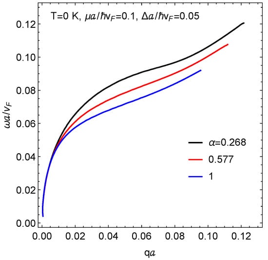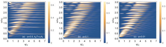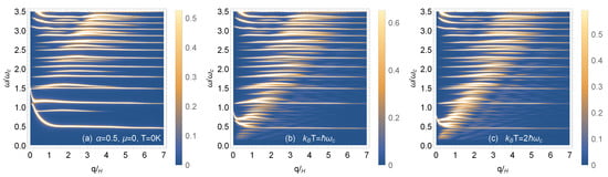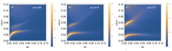 Figure 4 shows the plasmon dispersion when the chemical potential is placed in the “deformed” flat band, which has a local maximum when at , as seen in Figure 1, for various . But, when , the flat band is dispersionless. In all three panels of Figure 4, there are two plasmon branches. This is due to the allowed transitions between (i) the valence and conduction bands and (ii) the modified flat band and the conduction band. Interestingly, the intensity of the lower branch (valence to conduction band) remains the same in Figure 4a–c as is varied. However, the intensity of the upper branch (middle to conduction) is increased as is increased. As Equation (6) shows, the middle band is dispersionless when . This is in agreement with Figure 1a. Therefore, when , the density-of-states in the middle band from which transitions take place is infinite, thereby giving rise to a brighter plasmon branch.