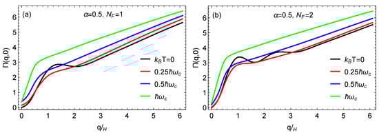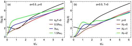 where the energy states are given by , is the Fermi-Dirac distribution function, and the form factor is given by . The auxilary parameter has also been used. At zero temperature, we have in terms of the Heaviside step function. In Figure 6 and Figure 7, we present our results for the static polarization function versus the wave vector q. We use the magnetic length and the cyclotron frequency . In Figure 6a, we chose , and, with the Fermi level in the flat band, we explore the behavior at various temperatures. At T = 0 K, there is no peak in the polarization, but, as the temperature is raised, a well defined peak emerges, which is clearly visible at , where . To interpret the significance of this shape, we turn to Figure 6b, where T = 0 K, and the number of occupied Landau levels is varied. When the Fermi level is within the flat band at zero temperature (), the polarization function has no peak, but this changes as the Fermi level is raised, and the number of peaks corresponds to the occupation number index . Therefore, we conclude that finite temperature in Figure 6a simulates the Landau level occupation which we impose in Figure 6b. In Figure 7a,b, we again chose for comparison with the results in Figure 6. These results show how the T = 0 K peaks for and are smeared as the temperature is increased, eventually disappearing at sufficiently high temperature.
