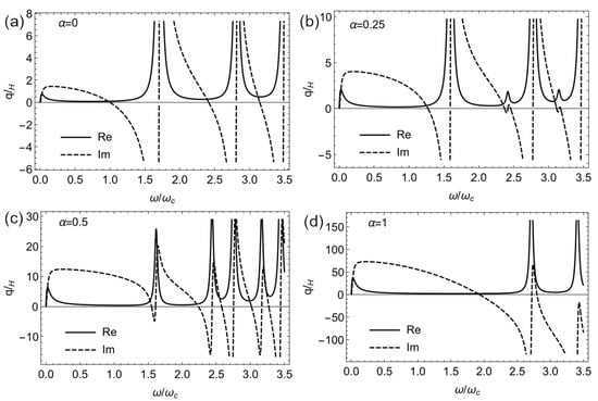 For undoped – with a mass term, the position of the Fermi level could give rise to characteristically different plasmon mode spectra. Referring to Figure 1, there are two energy gaps: one between the conduction and middle band and one between the middle band and the valence band. In Figure 4b, we observe two plasmon branches, which arise by design when the Fermi energy is located within the middle band, allowing possible transitions from within the valence and middle band to the conduction band. Comparing Figure 4a,b, we conclude that the mode with the higher frequency has its intensity reduced as is reduced, i.e., this mode becomes soft as the parameter where a phase transition occurs. The softening of low-frequency magnetoplasmon modes also occurs near this phase transition.