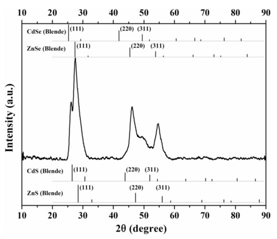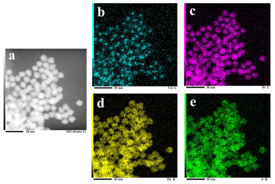- Deng, Z.; Yan, H.; Liu, Y. Band gap engineering of quaternary-alloyed ZnCdSSe quantum dots via a facile phosphine-free colloidal method. J. Am. Chem. Soc. 2009, 131, 17744–17745. [Google Scholar] [CrossRef]