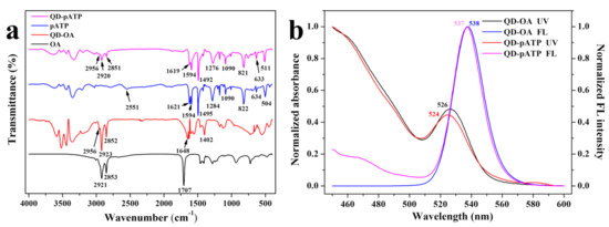 - OA ligand could be exchanged by pATP at the surface of CdZnSeS QDs to obtain specific optical properties concerning a response to acidity because of the dissociation of the pATP from the QDs under acidic conditions. The fluorescence response of CdZnSeS-pATP QDs to the acidity of paper samples has a wide acidity sensing range (1–7), high sensitivity (ca. 2.5-fold fluorescence intensity enhancement with pH values increasing from 1 to 7), good linearity (R2 = 0.99570) and excellent reproducibility (RSD of four measurements less than 5% at the same pH).