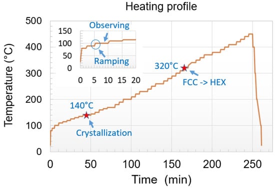 Typical heating profile used for in situ TEM annealing. The temperature was increased by steps of 5 °C from about 100 °C, using a ramping rate of 1 °C/s, and held for 5 min at this temperature during which the film was imaged (shown by the insertion). FCC to HEX refers to the transition from the face-centered cubic to the hexagonal phase.