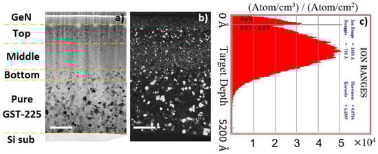 BF (a) and dark-field (DF) (b) images of the N-implanted GST-225 layer, annealed at 180 °C for 30 min. The N-implanted region is divided into different regions, the top, middle and bottom which are N-implanted, and the unimplanted region which provides the pristine reference. (c) SRIM simulation of the nitrogen depth-distribution after implantation. The white scale bars refer to a length of 100 nm.