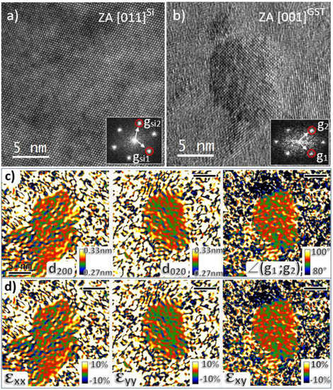 Figure 6 shows an HR-TEM image of the reference Si lattice (Figure 6a), an HR-TEM image of a large Ge2Sb2Te5 crystal located in the unimplanted region and viewed along the <001>GST zone axis (Figure 6b), and the result of the AbStrain analysis of this image (Figure 6c,d). Figure 6c shows the maps of the (200) and (020) interplanar distances and of the angle between these planes. From them, the maps of three strain tensor components, defined with reference to the perfect GST-225 cubic lattice, can be calculated (Figure 6d). The average measured values of d200 = 0.302581 nm, d020 = 0.301462 nm and ∠(g1;g2) = 90.7179° are very close to the values characteristic of the relaxed GST lattice expected at d200 = 0.301843, d020 = 0.301843 and ∠(g1;g2) = 90°. Consequently, all the three measured strain components were very close to zero. This is a clear evidence that the large nanocrystals located in the unimplanted region of the layer are made of pure and relaxed Ge2Sb2Te5 material.