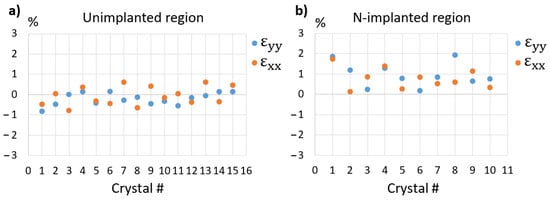Strain components (εxx, εyy) extracted from 15 large crystals in the unimplanted region (a) and 10 smaller crystals in the N-implanted region (b). The specimen was annealed at 210 °C for 30 min to initiate crystallization.