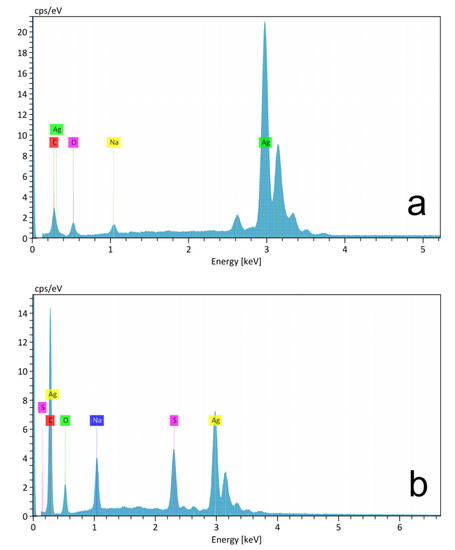 EDX spectra of AgNPs and AgNPs@11MUA are reported in Figure 3a,b, respectively. After dialysis, the EDX spectrum of AgNPs@11MUA revealed the presence of sulfur in the AgNPs@11MUA sample, indicating a good functionalization process.