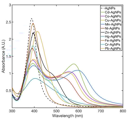 UV-VIS spectroscopy was used to evaluate the optical properties of AgNPs@11MUA and of its complexes thereof with Co2+, Mn2+, Cd2+, Cu2+, Zn2+, Fe2+, Hg2+, Pb2+, Cr3+, and Ni2+ ions.