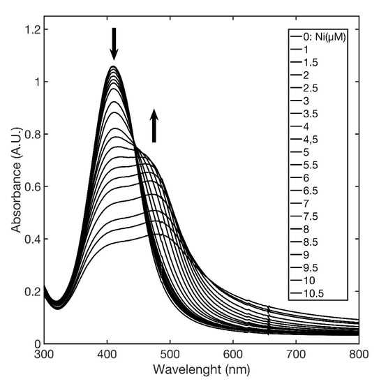 Specifically, AgNPs@11MUA showed a single SPAB at 417 nm, and the addition of Ni2+ caused a color change from yellow to purple, with the appearance of a second SPAB at 477 nm. In fact, Figure 6 shows that upon titration of AgNPs@11MUA with Ni2+ (in the range 0–10 µM), the SPABs at 417 and 477 nm decreased and increased in intensity with Ni2+, respectively.