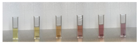 The color of nanoparticles depends on their shape, dimension, composition, and dielectric constant [12], and it changes in the state of aggregation of nanoparticles; the interparticle distance between aggregates causes a shift in the surface plasmon absorption band (SPAB) with respect to monodisperse ones [13,14]. This dependence of SPAB on the state of aggregation is the principle for the detection of chemical substances by colorimetric sensors based on nanoparticles [15].