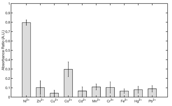 The best fitted values for the parameter to 95% confidence bounds were m = 0.1572 ± 0.0171 and q = −0.3885 ± 0.0095. Fitting results gives an R square of 0.9853 with an SSE of 0.0055. The limits of detection (LOD) and limits of quantitation (LOQ) were calculated from the calibration curve as 3 σ/m and 10 σ/m [53], where σ is the standard deviation of intercept, and m is the slope of the regression curve fitting the data points in the linear range (3–7 µM). The obtained value of LOD and LOQ were 2.15 µM and 7.16 µM, respectively. Although presenting a similar general behavior, all other metal ions of interest were associated with minor-to-negligible changes in UV-VIS spectra (Figure S2, Supplemental Materials). For comparative purposes, the responses at 7.5 µM of each metal ion are shown in the bar plot reported Figure 10 and in UV-VIS spectra in Figure S3.