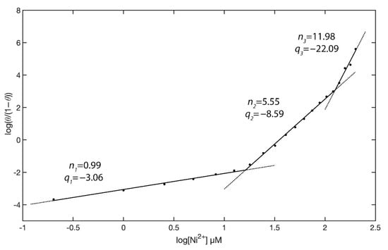 Hill plot for at AgNPs@11MUA binding to increasing concentrations of Ni2+. Local linear fits to Equation (3) are displayed as solid lines.