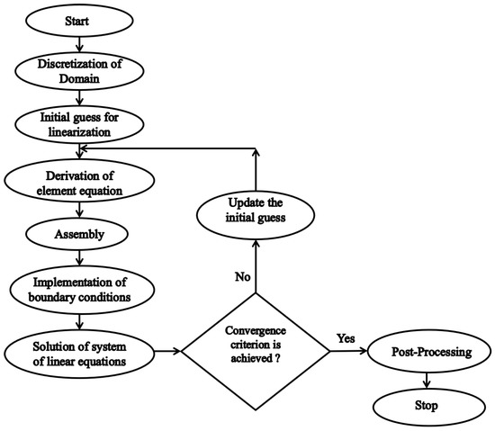 The Galerkin finite element approach (GFEM) is one of the well-known numerical strategies to discover approximate solutions of ODE in addition to PDE system that includes complex boundary situations and/or complicated geometry. The working of finite element method are shown in Figure 2. To solve this system of non-linear differential Equations (13)–(16) following (Swapna et al. [6], Rana et al. [7], Goyal et al. [9]), the weak formulation procedure has been adopted and represents the typical linear/quadratic element that is created by weighted residual formulation having element coordinates , is given by