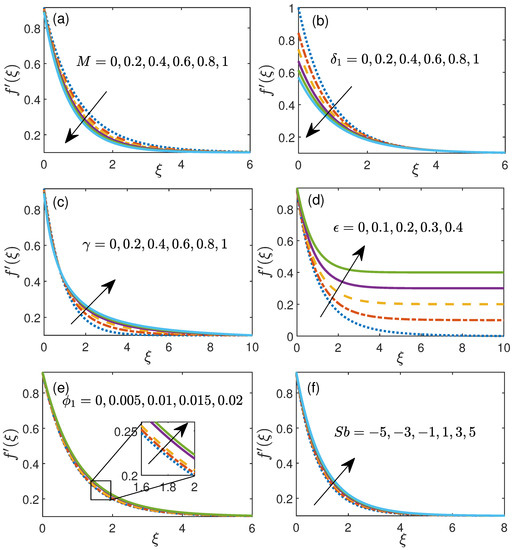 Furthermore, Figure 5c manifests the effect of Stefan blowing parameter (−5 to 5) on nanoparticle volume fraction. Here, this graph shows that, volume fraction enhances with an increment in . On the other hand, nanoparticle volume fraction declines for higher values of (0 to 0.02) as depicted in Figure 5d. Figure 5e shows the effect of (0.001 to 0.05) on profile of nanoparticle volume fraction. With an increment in , nanoparticles slam into one another with higher speed which brings about diminishing of nanoparticle volume fraction and subsequently, the Sherwood number lessens as portrayed in Table 5. Figure 5f representations variety of nanoparticle volume fraction against . This diagram shows that with an increment in thermophoresis , nanoparticle volume fraction upgrades. Fundamentally, in the event of thermophoresis applied by a molecule on the other molecule will produce the development of particle movement from more sizzling to colder part and thus strengthening in the nanoparticle volume fraction is noticed through Figure 5f.
