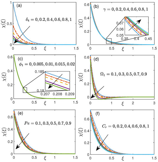 Figure 6a shows the influence of micro-organism slip parameter (0 to 1) over motile concentration. This figure elaborates that motile concentration falls with rise in motile slip parameter . Figure 6b manifests the impact of curvature parameter (0–1) on . An enhancement in the value of motile concentration is noticed for higher value of curvature parameter . Additionally, motile concentration decreases for higher values of initial volume fraction and concentration difference parameter as shown in Figure 6c,d respectively. It is imagined that the non-negative estimations of Peclet number subverts the thickness of gyrotactic micro-organisms since more improves the movement of liquid particles prompting more slender micro-organisms as seen in Figure 6e. Figure 6f illustrates motile concentration against the chemical reaction parameter (0 to 1) and this shows that motile concentration falls with rise in chemical reaction parameter .