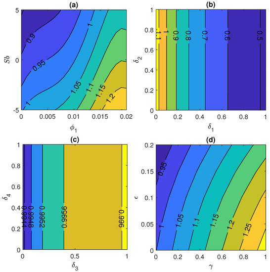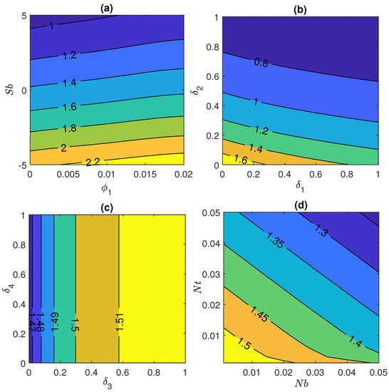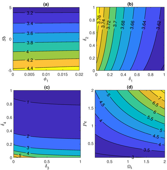 Afterthat, Figure 8c describes the variation in heat transfer under the impact of and . It is noted from the graph that heat transfer rate increases with only variation in volume fraction slip parameter as a negligible effect is found in case of motile concentration density parameter. Furthermore, the joined impact of higher and causes the rate of heat transfer to decline as shown in Figure 8d via contour plot.