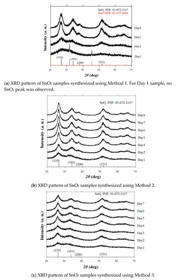 We previously reported that anatase TiO2 nanoaggregates can be produced by freeze drying using Ti-gel precursors []. This result stimulated our interest in the growth control of SnO2 nanoaggregates at low temperatures. The XRD patterns of the powder samples obtained using three sets of reactions (Methods 1–3) are shown in Figure 1a–c. All the observed peaks are in agreement with those of tetragonal rutile SnO2 (JCPDS 01-072-1147), except for the Method 1–Day 1 sample. In the early stage of the sol–gel process in Method 1, only the impurity phase of NaCl is detected, and no SnO2 peak is observed. All the peaks corresponding to SnO2 are identified for the rest of the samples obtained via Method 1. It is observed that the intensity of the SnO2 peaks increases with the reaction times for all methods, indicating that long reaction times lead to the enhancement of the SnO2 crystal growth.