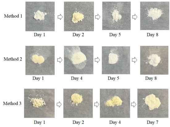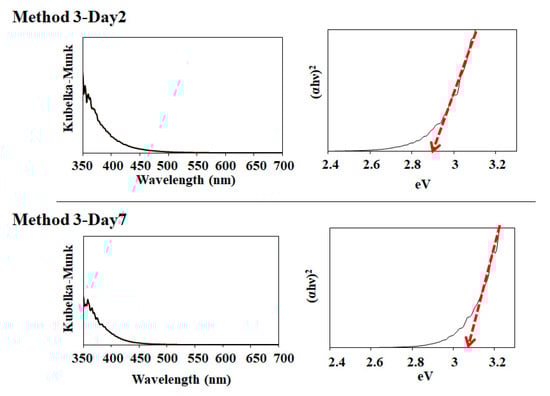 Additionally, we measured the optical absorption of several SnO2 samples of Methods 1–3 using diffuse reflectance spectroscopy, as shown in Figure 7. Notably, the samples of Method 1–Day 2, Method 2–Day 2, Method 3–Day 2, and Method 3–Day 7 showed an absorption tail in the visible wavelength. Their observed bandgaps were estimated to be 3.1, 3.0, 2.9, and 3.1 eV for Method 1–Day 2, Method 2–Day 2, Method 3–Day 2, and Method 3–Day 7, respectively. It was reported that the narrower bandgaps compared to a well-known bandgap of 3.6 eV [,] is due to the elevation of the valence-band maximum of SnO2 induced by the oxygen vacancies [,]. The bandgap of Method 1–Day 8 and Method 2–Day 7 was 3.6 eV.