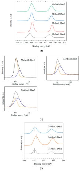 (a) X-ray photoelectron spectroscopy (XPS) spectra of Method 1–Day 1, Method 1–Day 8, Method 2–Day 8, and Method 3–Day 7 samples corresponding to Sn 3d5/2; (b) XPS spectra of the same samples (except Method 1–Day 1) showing O 1s peaks; (c) XPS spectra of Method 3–Day 1, Method 2–Day 1, and Method 1–Day 1 samples.