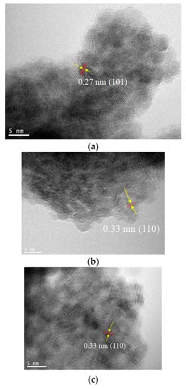 To resolve the SnO2 nanostructures and elucidate their growth mechanism, HRTEM measurements were performed, as shown in Figure 4. The crystallization was not significant for all early-stage samples, such as the Method 1–Day 1 sample, as shown in the selected area diffraction (SAD) pattern (not shown). As the reaction times increase, lattice fringes with d-spacings of 0.33 nm and 0.27 nm corresponding to the (110) and (101) planes, respectively, are clearly observed for all methods. The measurements indicated that the aggregated particles consisting of tiny nanocrystals were formed from precursor Sn(II)-based gels, where the average sizes of the primary nanocrystals were in the range of 2~5 nm (Table 1), which are consistent with the estimated crystallite sizes in Table 2. Notably, the diffraction spots in SAD patterns become more noticeable as the reaction proceeds, although the corresponding measured area showed numerous tiny nanoparticles, as shown in Figure 5. This further indicated the improved crystallinity of the long-reaction-time samples.